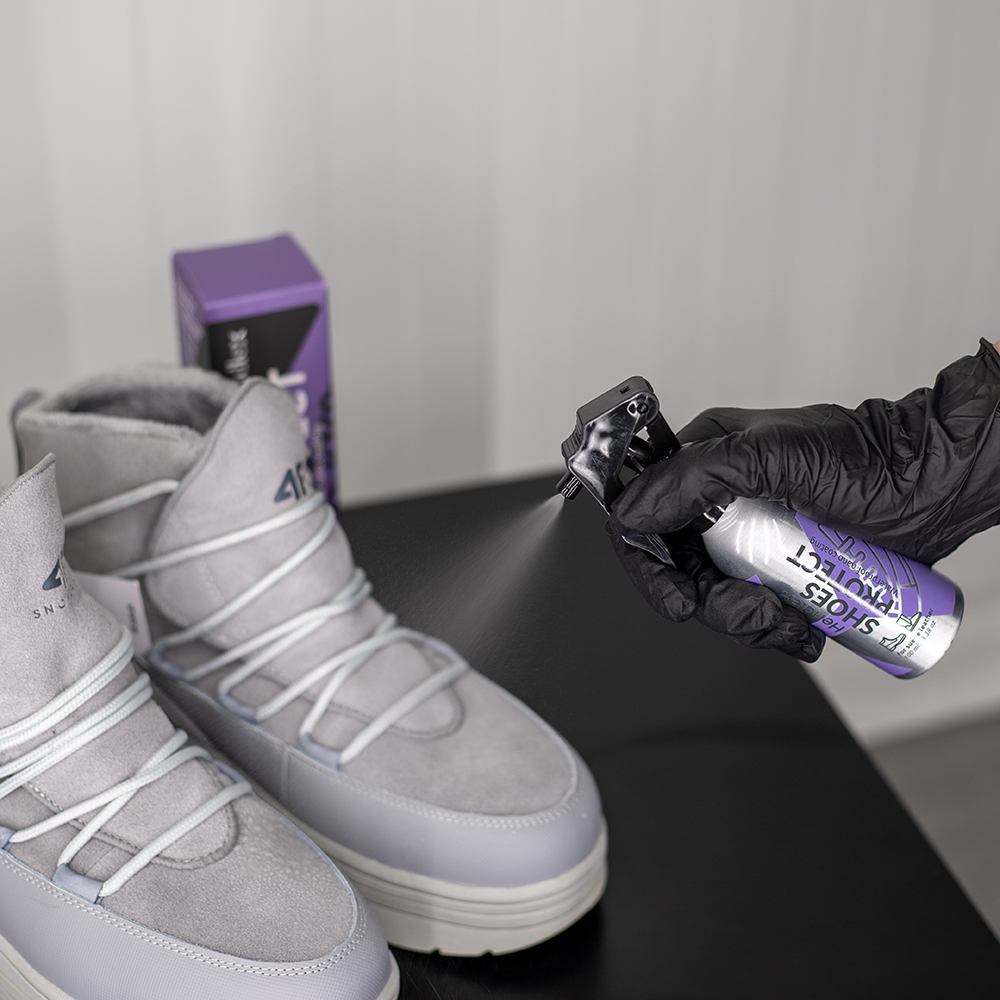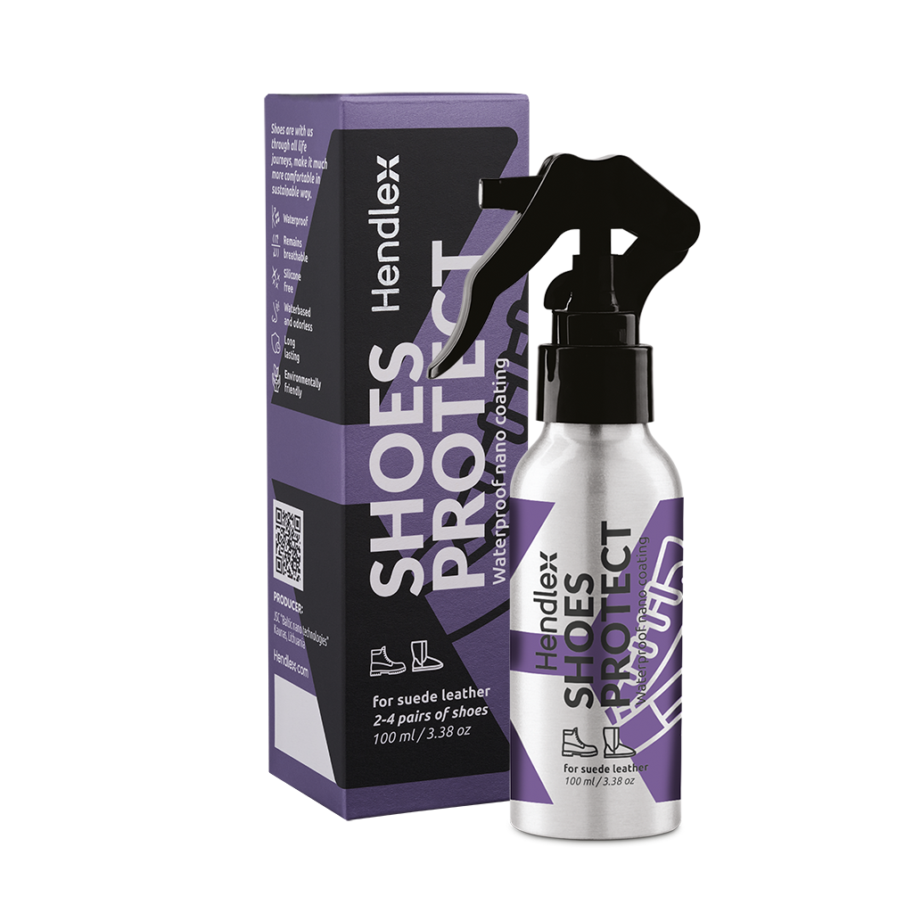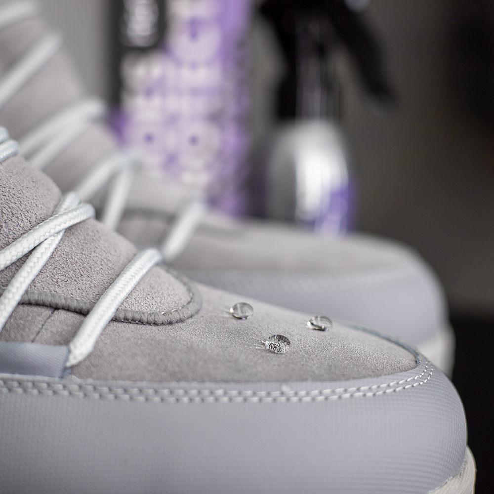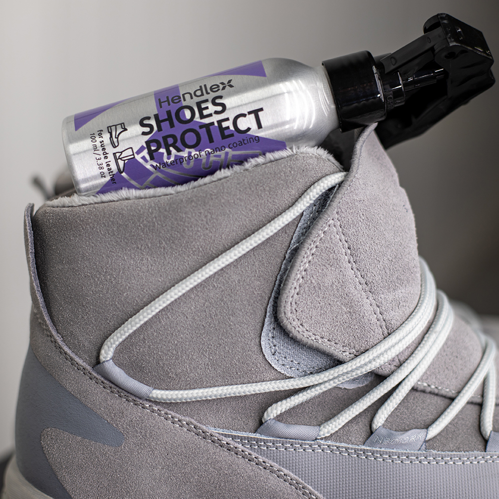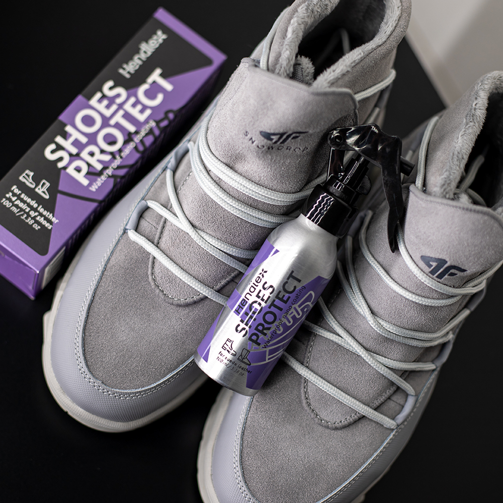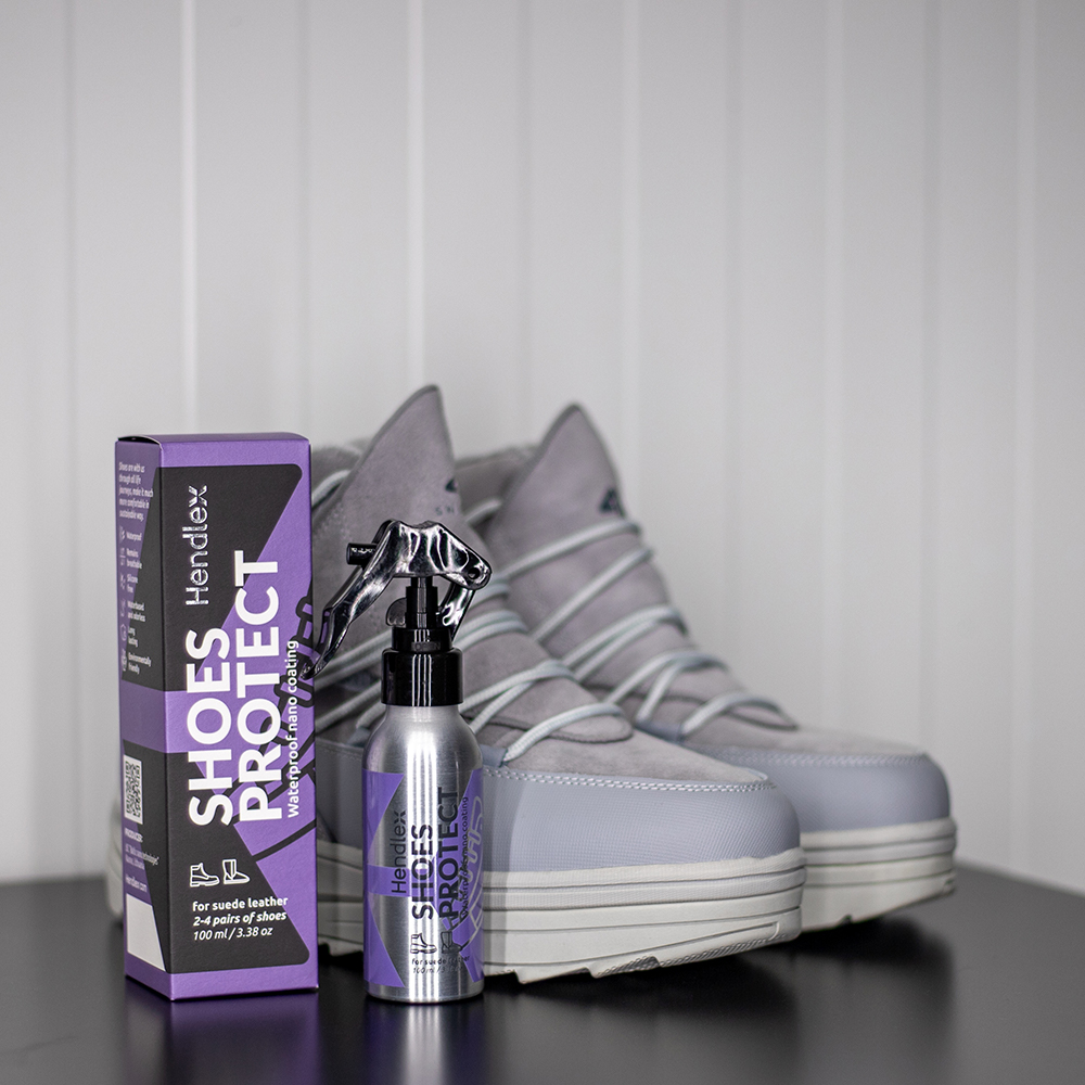 Nano coating for suede leather shoes. The coating soaks deep into the fabric fibers, forming an invisible protective layer that repels water and protects against dirt, mud, and stains. The color and texture of the surface remain unchanged.